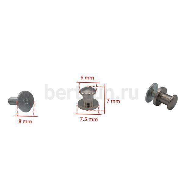 - Фурнитура №44 кнопка кабурная для сумок и ремней 6*8 мм никель 10 шт/уп BERT